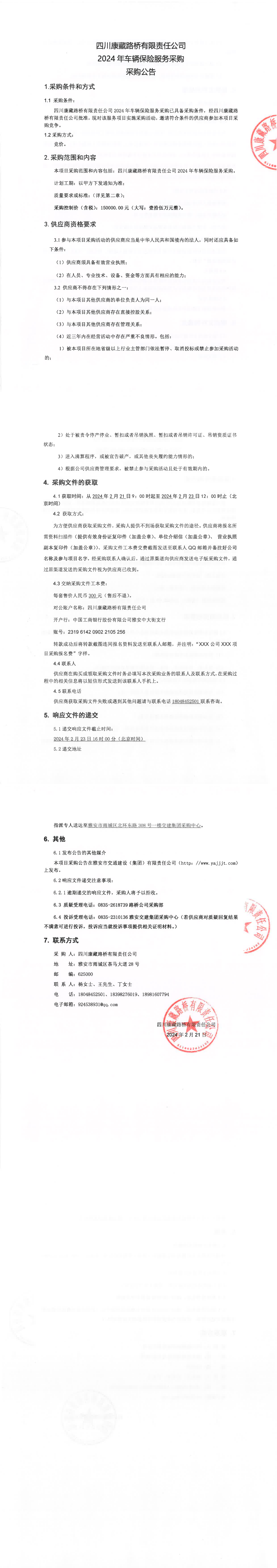 四川康藏路橋有限責(zé)任公司2024年車輛保險(xiǎn)服務(wù)采購(gòu)公告