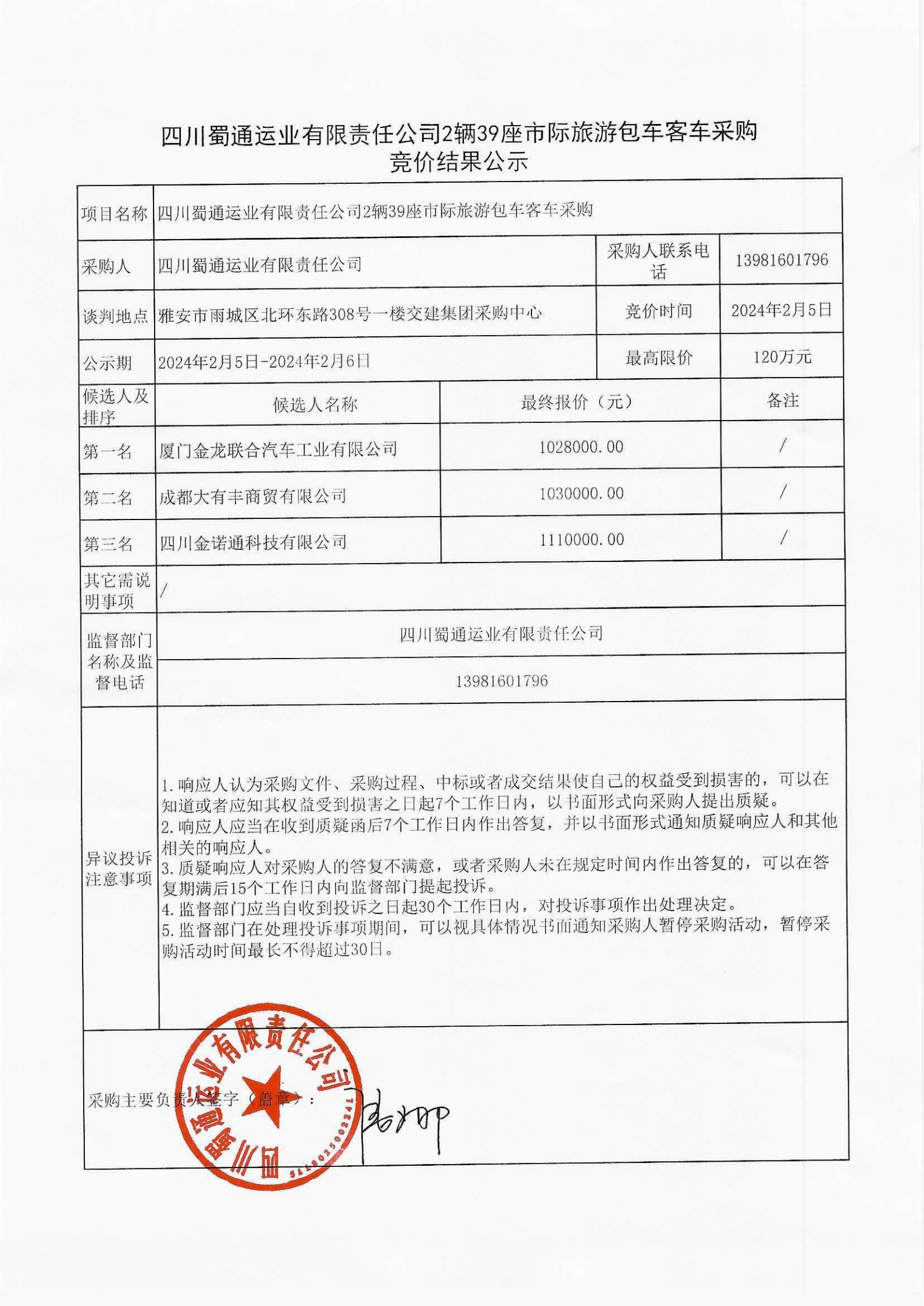 四川蜀通運(yùn)業(yè)有限責(zé)任公司2輛39座市際旅游包車客車采購競價結(jié)果公示