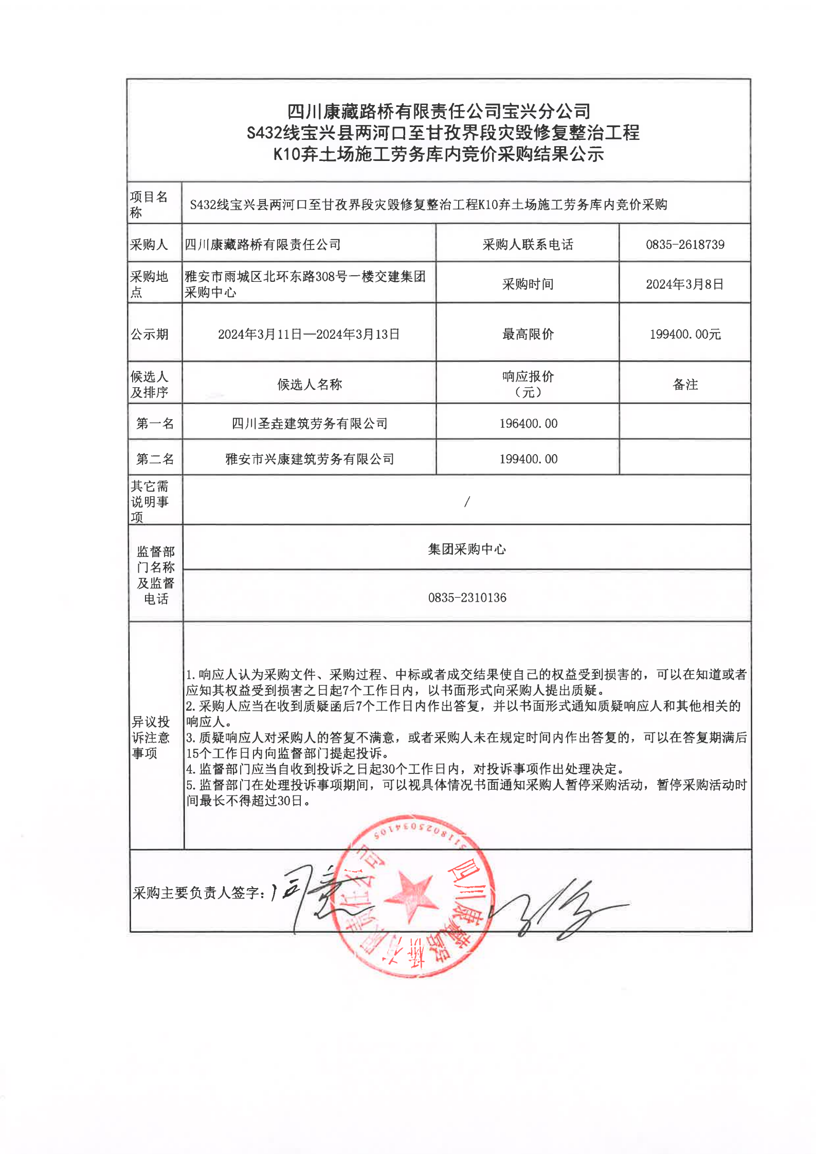 四川康藏路橋有限責(zé)任公司寶興分公司S432線寶興縣兩河口至甘孜界段災(zāi)毀修復(fù)整治工程K10棄土場施工勞務(wù)庫內(nèi)采購結(jié)果公示