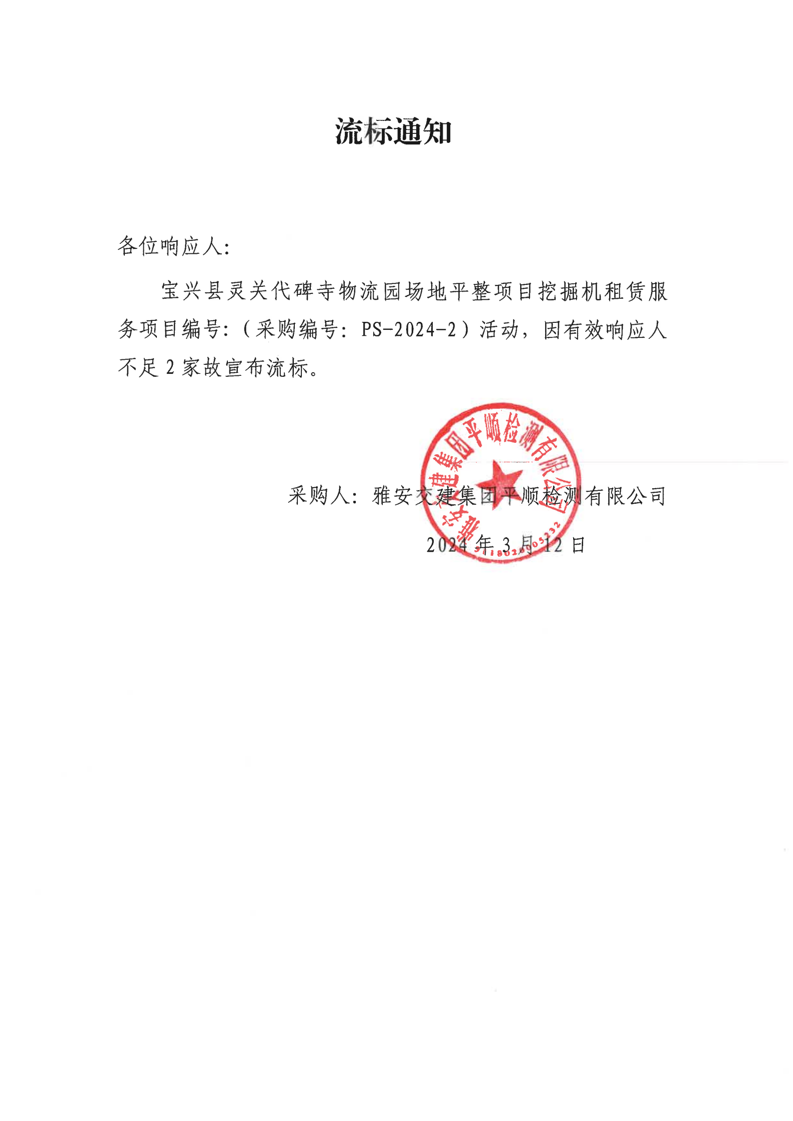 雅安交建集團平順檢測有限公司寶興縣靈關(guān)代碑寺物流園場地平整項目挖掘機租賃服務(wù)流標(biāo)通知