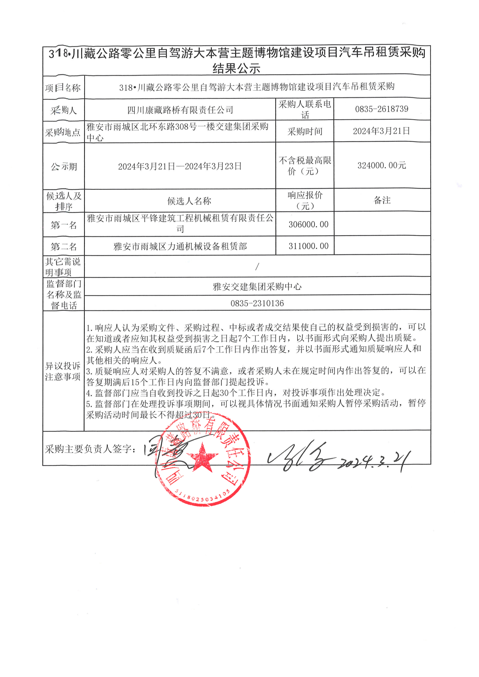 四川康藏路橋有限責(zé)任公司318·川藏公路零公里自駕游大本營主題博物館建設(shè)項(xiàng)目汽車吊租賃采購結(jié)果公示