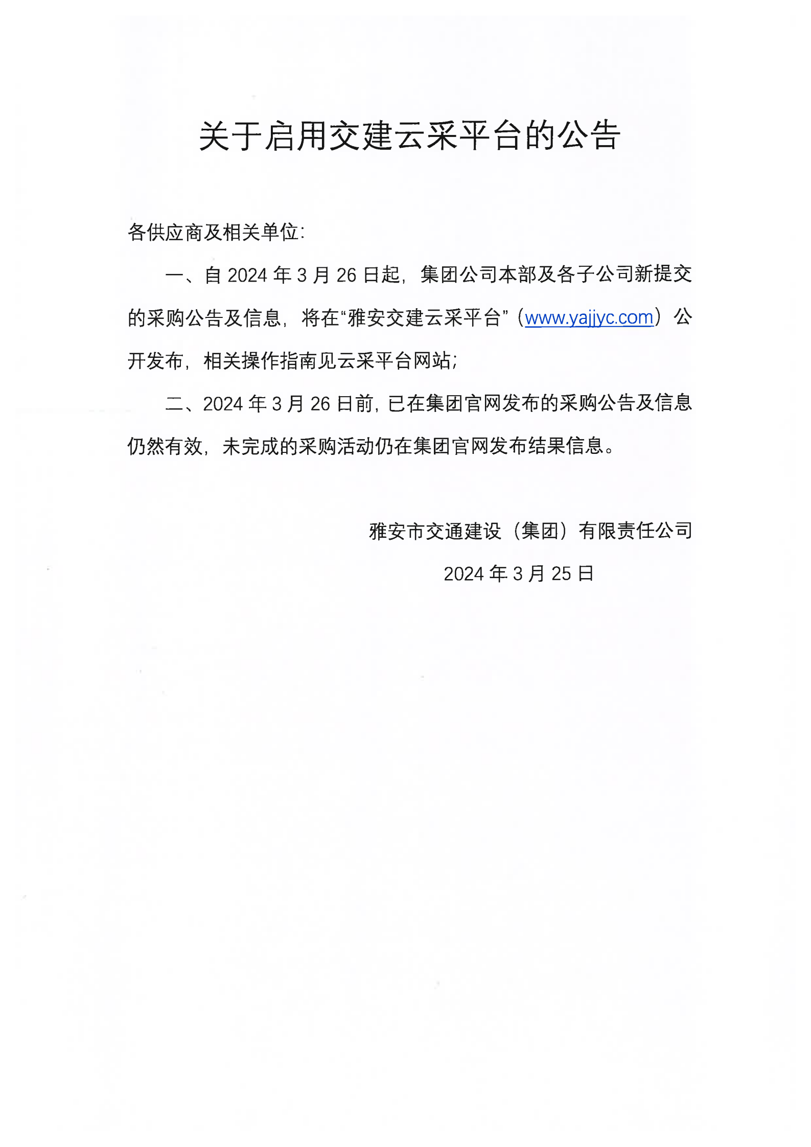 雅安市交通建設(shè)(集團(tuán))有限責(zé)任公司關(guān)于啟用交建云采平臺(tái)的公告