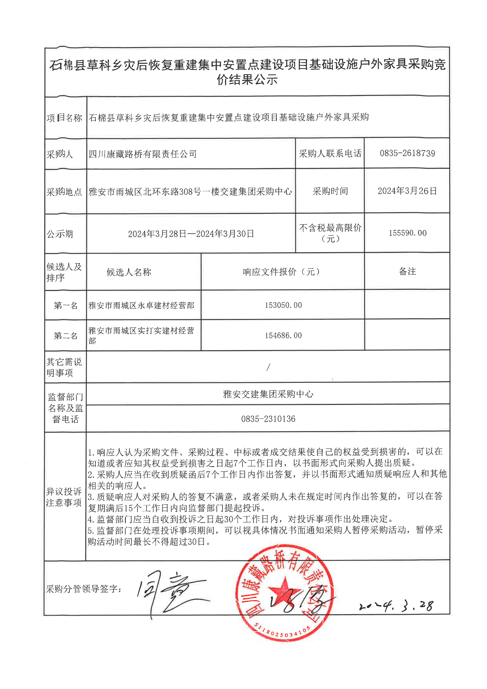 四川康藏路橋有限責(zé)任公司石棉縣草科鄉(xiāng)災(zāi)后恢復(fù)重建集中安置點(diǎn)建設(shè)項(xiàng)目基礎(chǔ)設(shè)施戶外家具采購(gòu)競(jìng)價(jià)結(jié)果公示