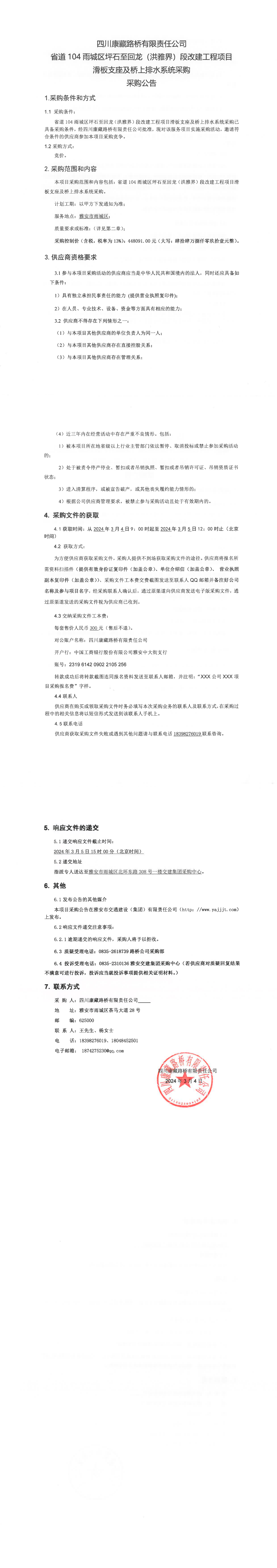 四川康藏路橋有限責(zé)任公司省道104雨城區(qū)坪石至回龍(洪雅界)段改建工程項目滑板支座及橋上排水系統(tǒng)采購公告
