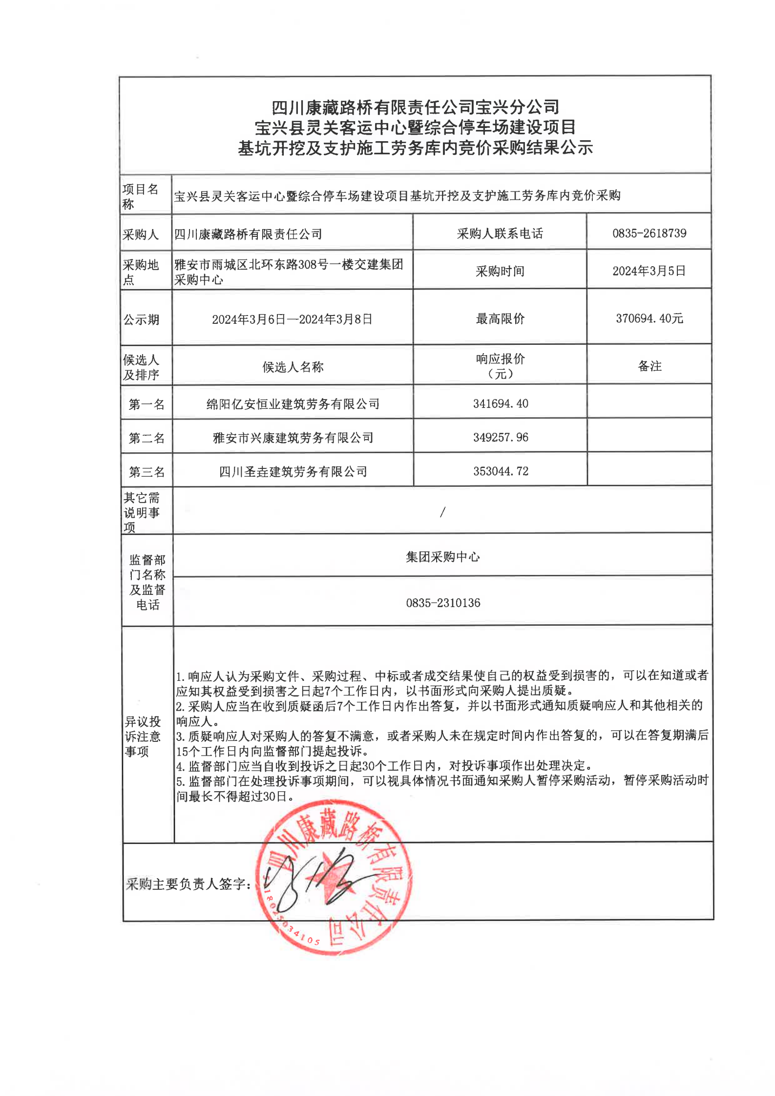 四川康藏路橋有限責(zé)任公司寶興分公司寶興縣靈關(guān)客運中心暨綜合停車場建設(shè)項目基坑開挖及支護(hù)施工勞務(wù)庫內(nèi)競價采購結(jié)果公示