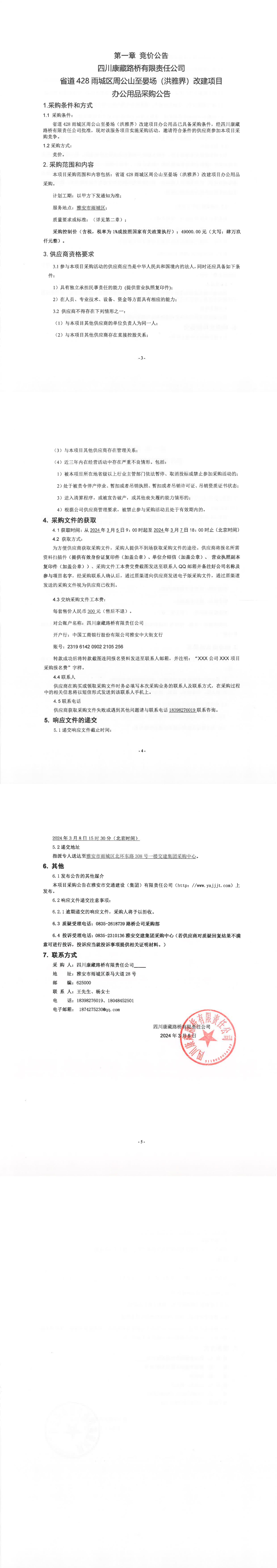 四川康藏路橋有限責(zé)任公司省道428雨城區(qū)周公山至晏場(洪雅界)改建項(xiàng)目辦公用品采購公告
