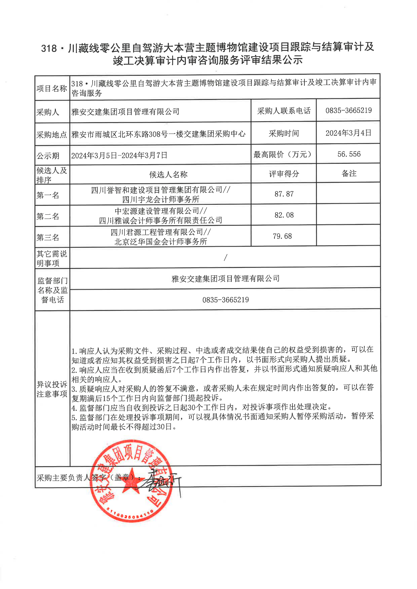 雅安交建集團(tuán)項(xiàng)目管理有限公司318·川藏線零公里自駕游大本營(yíng)主題博物館建設(shè)項(xiàng)目跟蹤與結(jié)算審計(jì)及竣工決算審計(jì)內(nèi)審咨詢(xún)服務(wù)評(píng)審結(jié)果公示