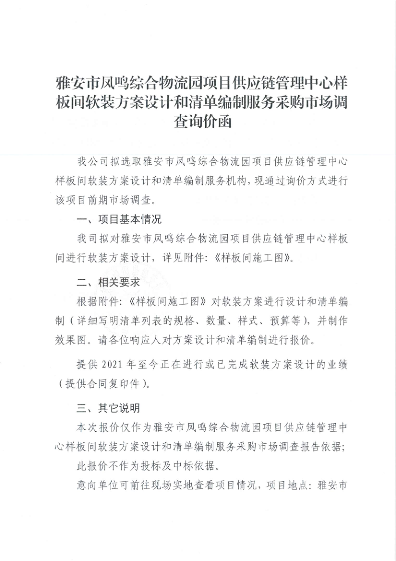 雅安交建集團(tuán)物流發(fā)展有限公司雅安市鳳鳴綜合物流園項(xiàng)目供應(yīng)鏈管理中心樣板間軟裝方案設(shè)計(jì)和清單編制服務(wù)采購市場調(diào)查詢價(jià)函