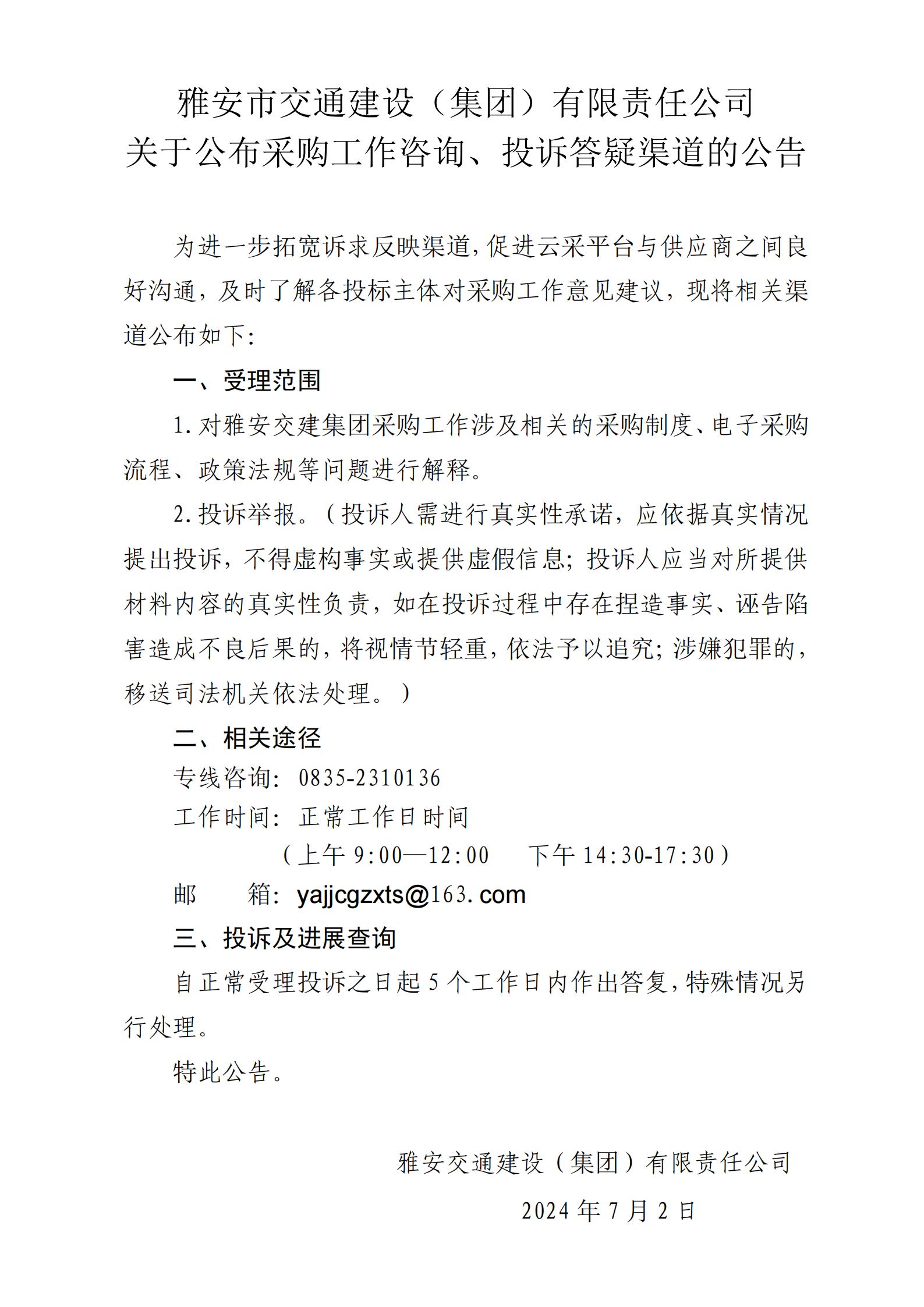 雅安市交通建設(shè)(集團(tuán))有限責(zé)任公司關(guān)于公布采購(gòu)工作咨詢(xún)、投訴答疑渠道的公告