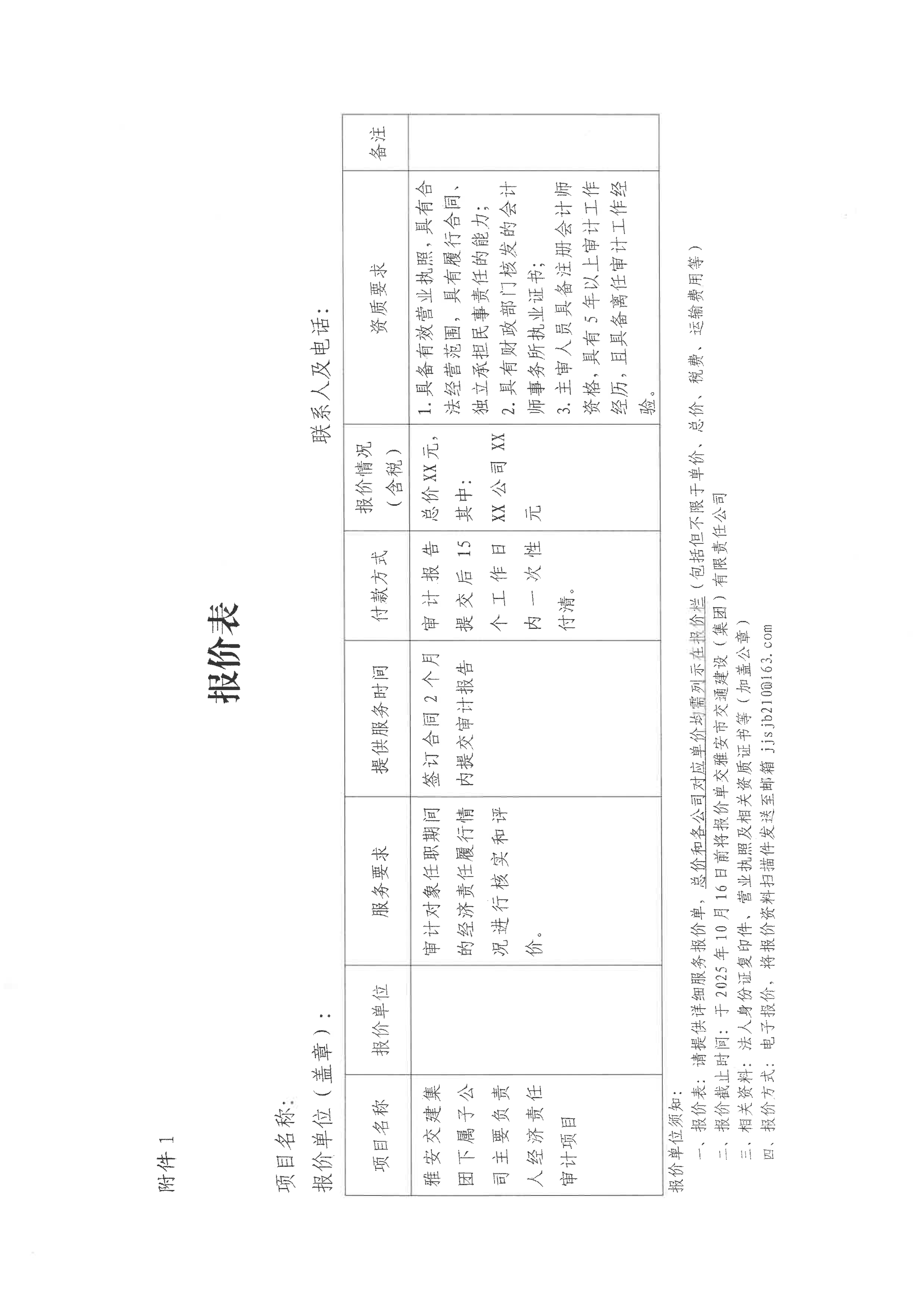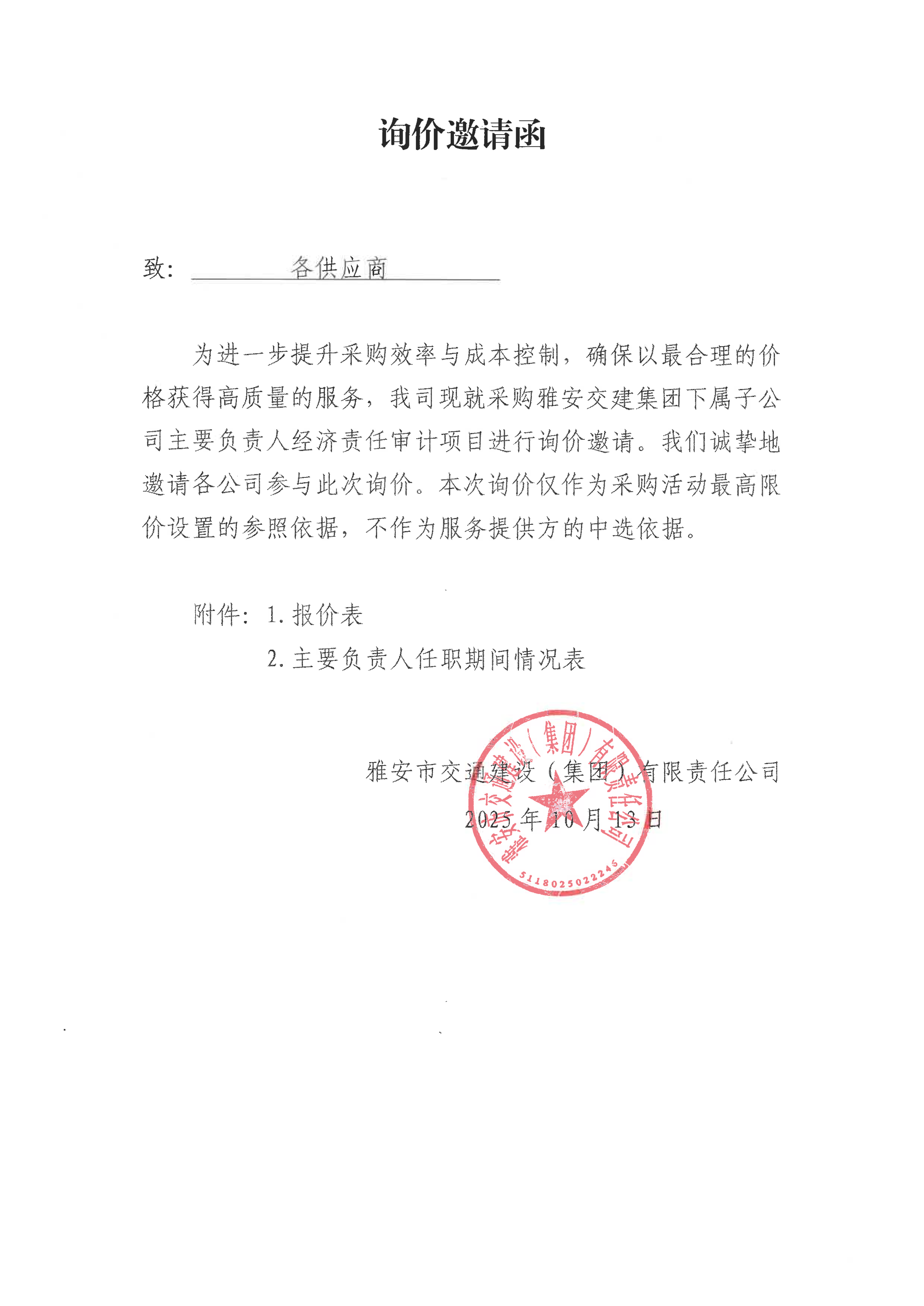 關(guān)于雅安交建集團下屬子公司主要負(fù)責(zé)人經(jīng)濟責(zé)任審計項目限價的詢價函