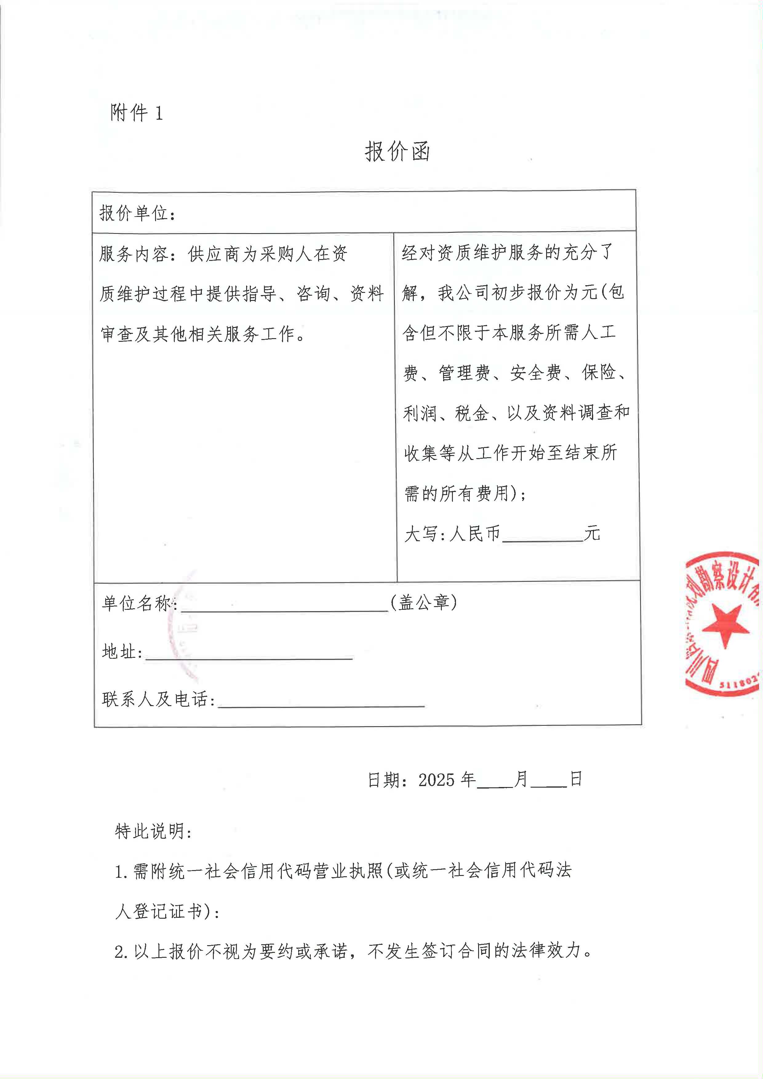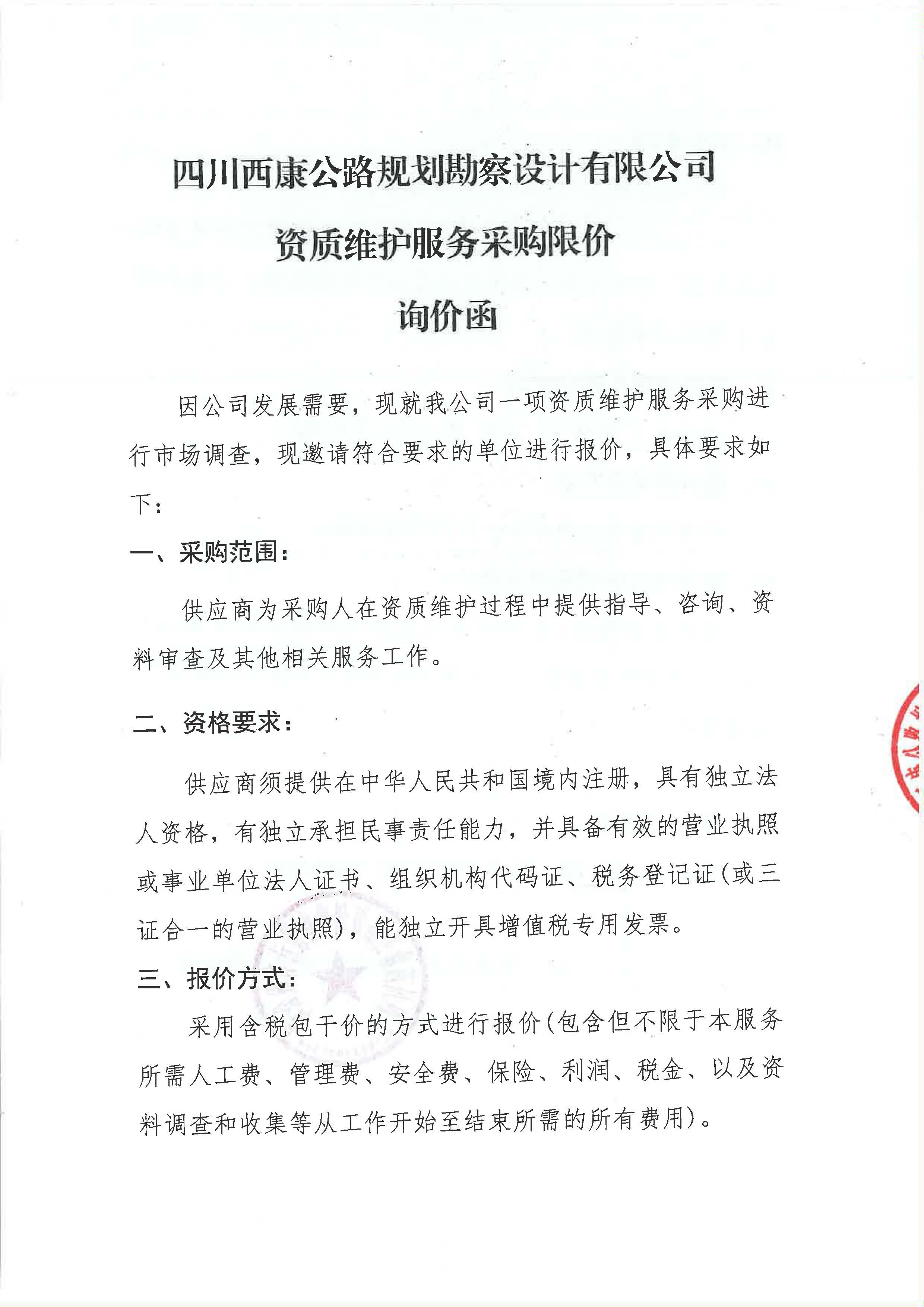 四川西康公路規(guī)劃勘察設計有限公司資質(zhì)維護服務采購限價詢價函