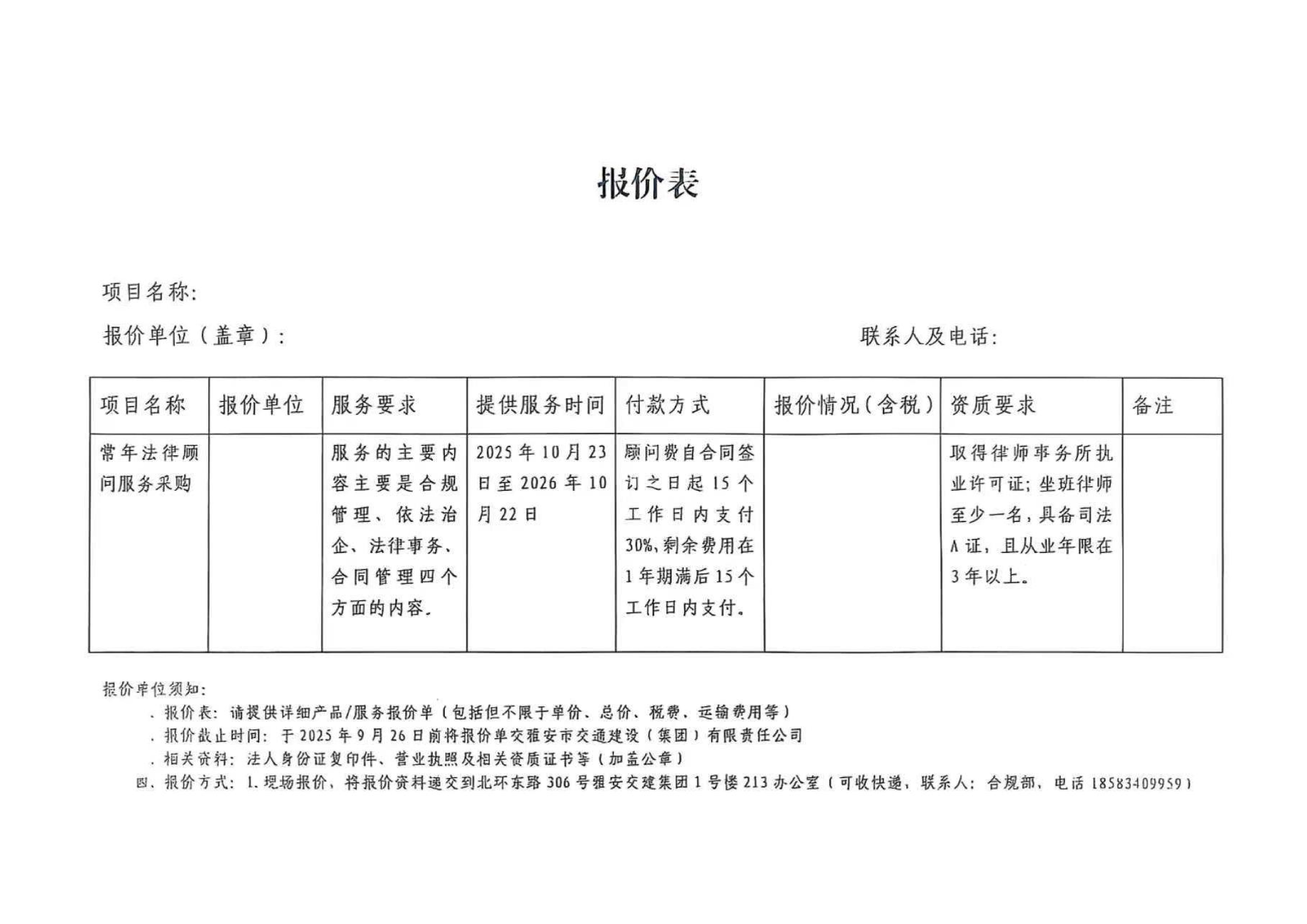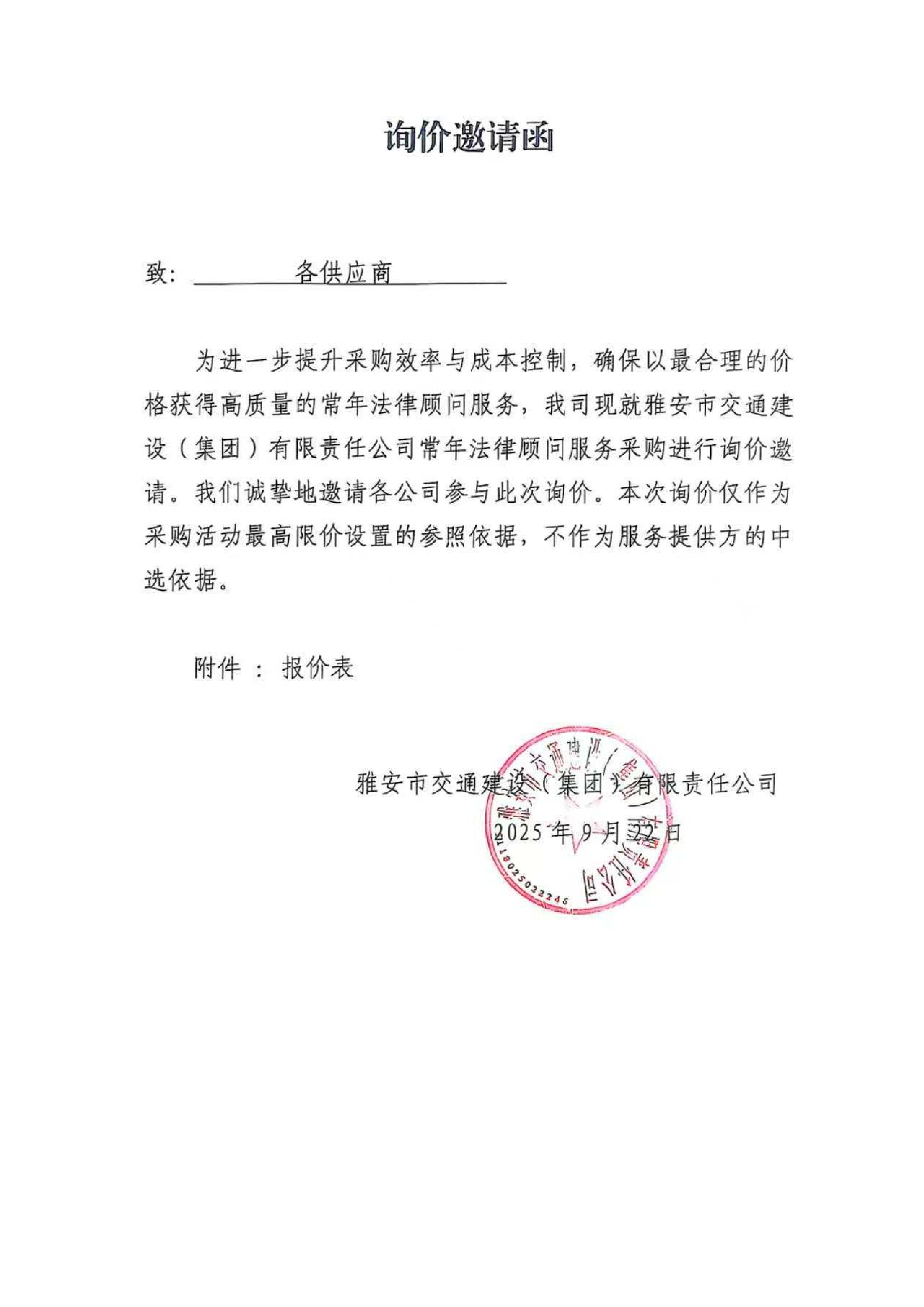 關(guān)于雅安市交通建設(shè)(集團(tuán))有限責(zé)任公司常年法律顧問服務(wù)的詢價函