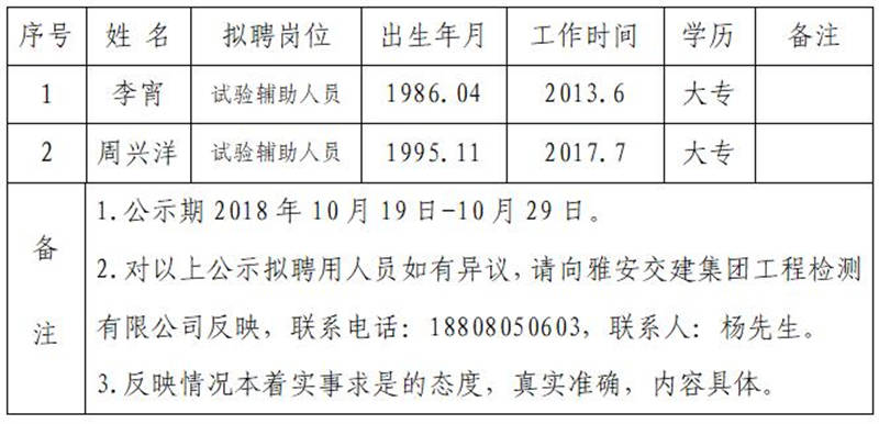 通過公開報名、資格審查、綜合測試等程序,經(jīng)雅安交建集團工程檢測有限公司研究擇優(yōu)確定以下2名擬聘用人員,現(xiàn)公示名單如下: