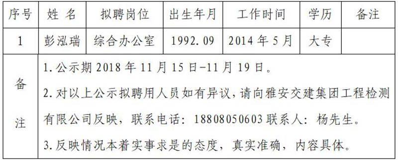 通過(guò)公開報(bào)名、資格審查、綜合測(cè)試等程序,經(jīng)雅安交建集團(tuán)工程檢測(cè)有限公司研究擇優(yōu)確定以下1名擬聘用人員,現(xiàn)公示名單如下: