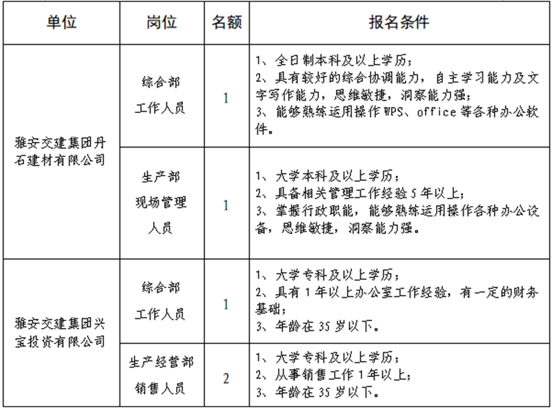 根據(jù)發(fā)展需要,決定面向社會公開招聘雅安市交通建設(shè)(集團(tuán))有限責(zé)任公司(以下簡稱“雅安交建集團(tuán)”)所屬子公司工作人員5名,現(xiàn)將有關(guān)事項(xiàng)公告如下: