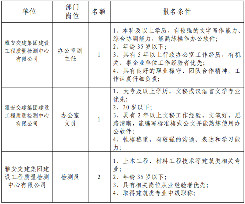根據(jù)發(fā)展需要,決定面向社會公開招聘雅安市交通建設(shè)(集團)有限責(zé)任公司(以下簡稱“雅安交建集團”)所屬子公司工作人員4名,現(xiàn)將有關(guān)事項公告如下: