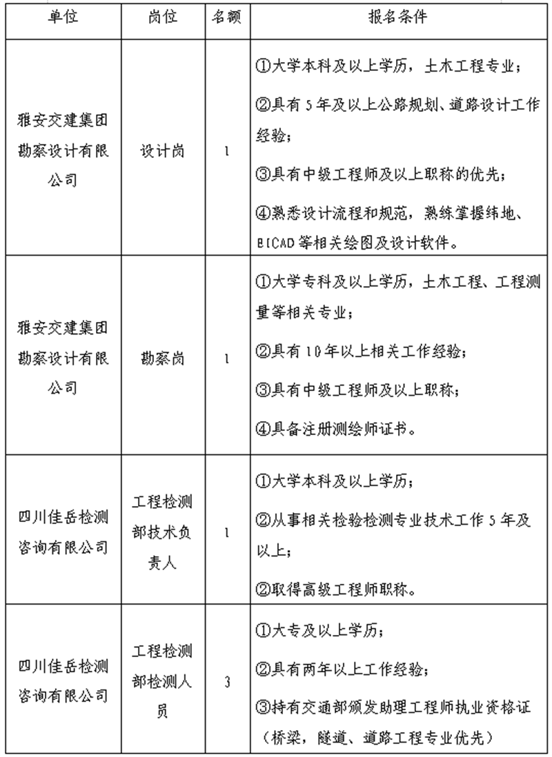 雅安交建集團(tuán)關(guān)于公開(kāi)招聘所屬子公司工作人員的公告(勘察設(shè)計(jì)公司、佳岳公司)
