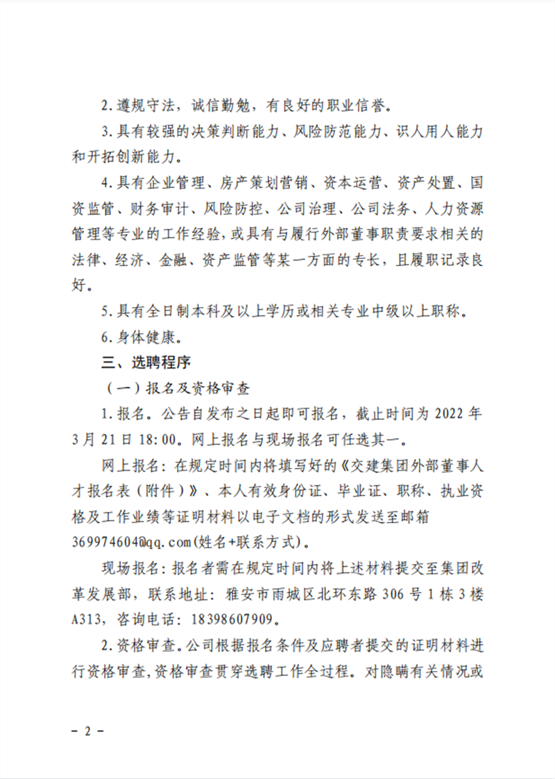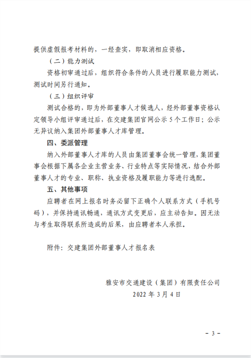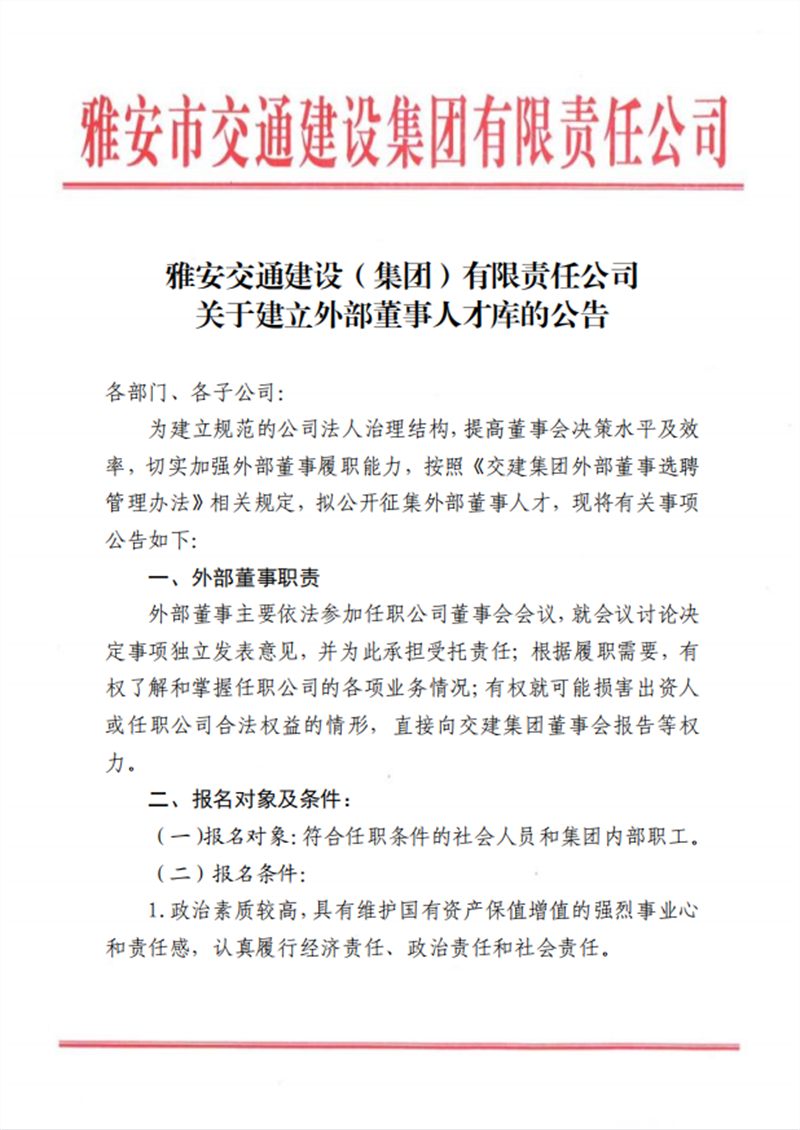雅安交通建設(集團)有限責任公司 關(guān)于建立外部董事人才庫的公告