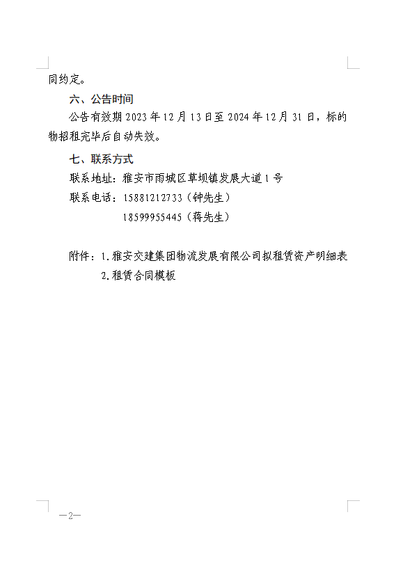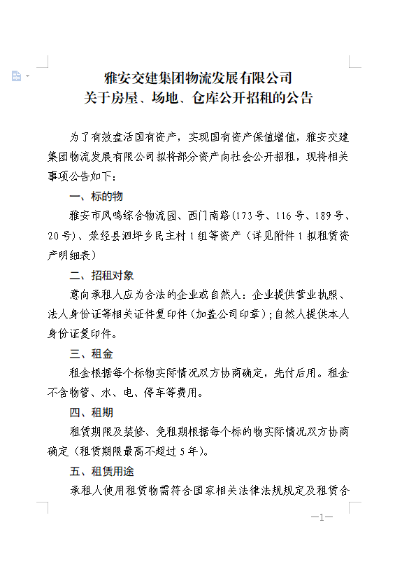 雅安交建集團(tuán)物流發(fā)展有限公司關(guān)于房屋、場地、倉庫公開招租的公告
