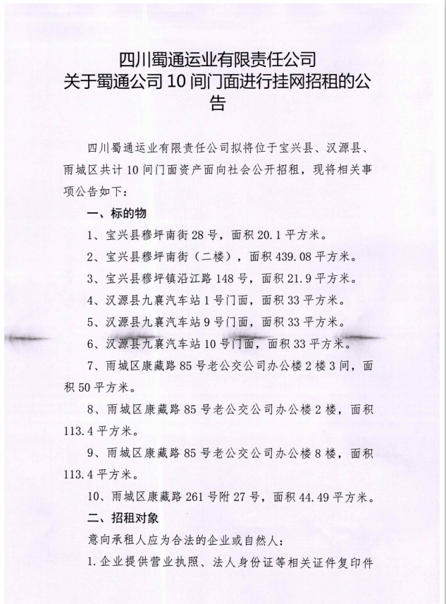 關(guān)于蜀通公司10間門(mén)面進(jìn)行掛網(wǎng)招租的公告
