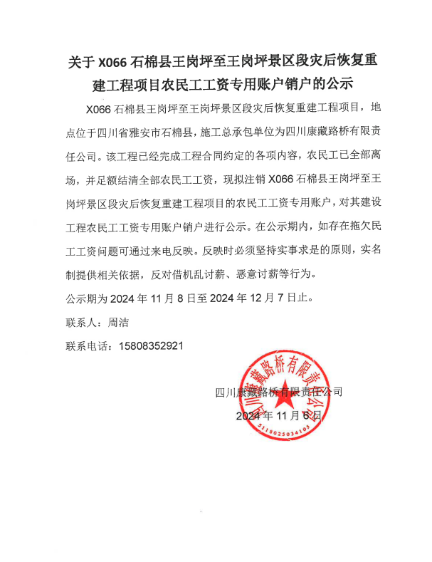 關(guān)于X066石棉縣王崗坪至王崗坪景區(qū)段災(zāi)后恢復(fù)重建工程項(xiàng)目農(nóng)民工工資專用賬戶銷(xiāo)戶的公示
