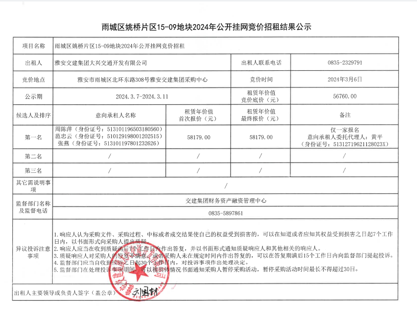 雨城區(qū)姚橋片區(qū)15-09競(jìng)價(jià)招租結(jié)果公示