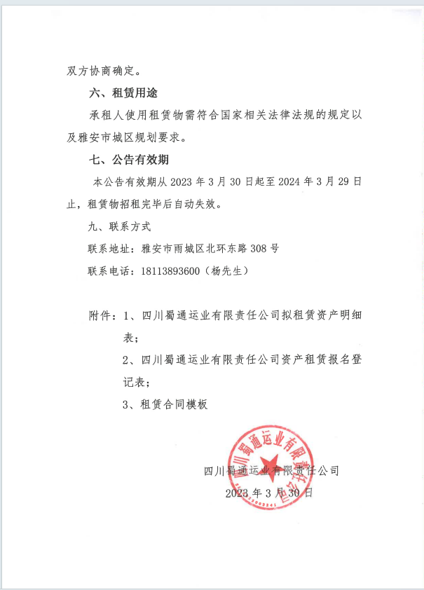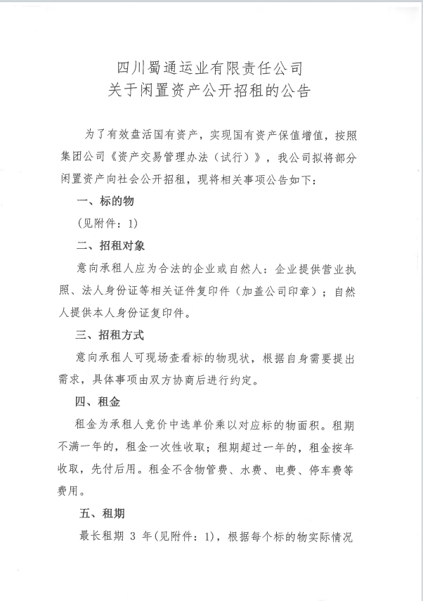 蜀通運(yùn)業(yè)有限責(zé)任公司關(guān)于閑置資產(chǎn)公開(kāi)招租的公告