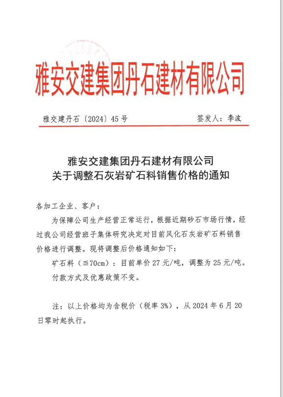 關(guān)于調(diào)整石灰?guī)r礦石料銷售價格的通知