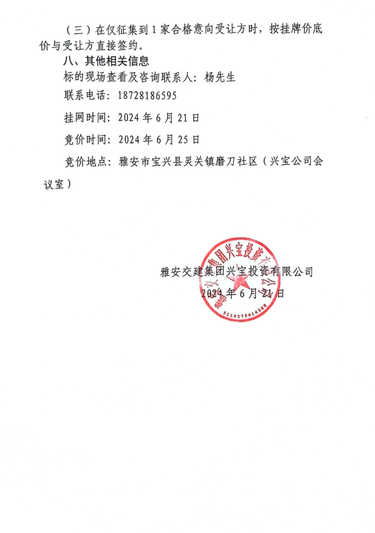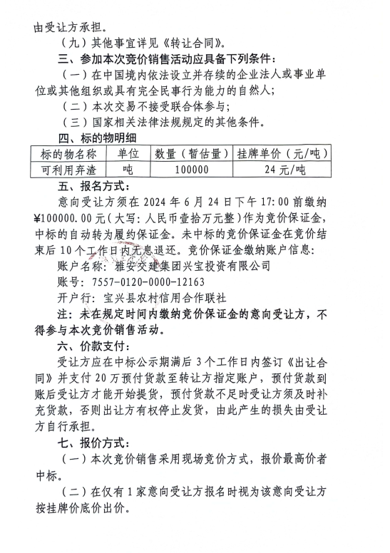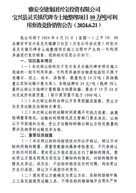 雅安交建集團(tuán)興寶投資有限公司寶興縣靈關(guān)鎮(zhèn)代碑寺土地整理項目10萬噸可利用棄渣競價銷售公告(2024.6.21)