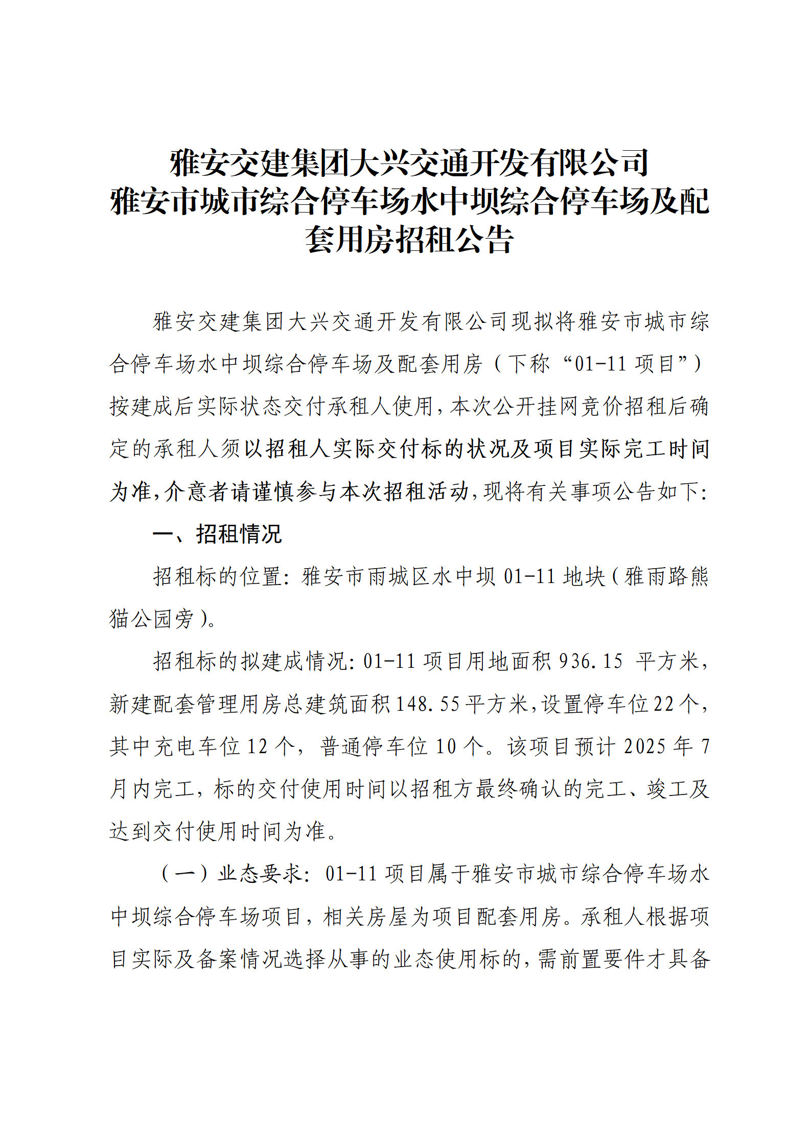 雅安交建集團大興交通開發(fā)有限公司 雅安市城市綜合停車場水中壩綜合停車場及配套用房招租公告