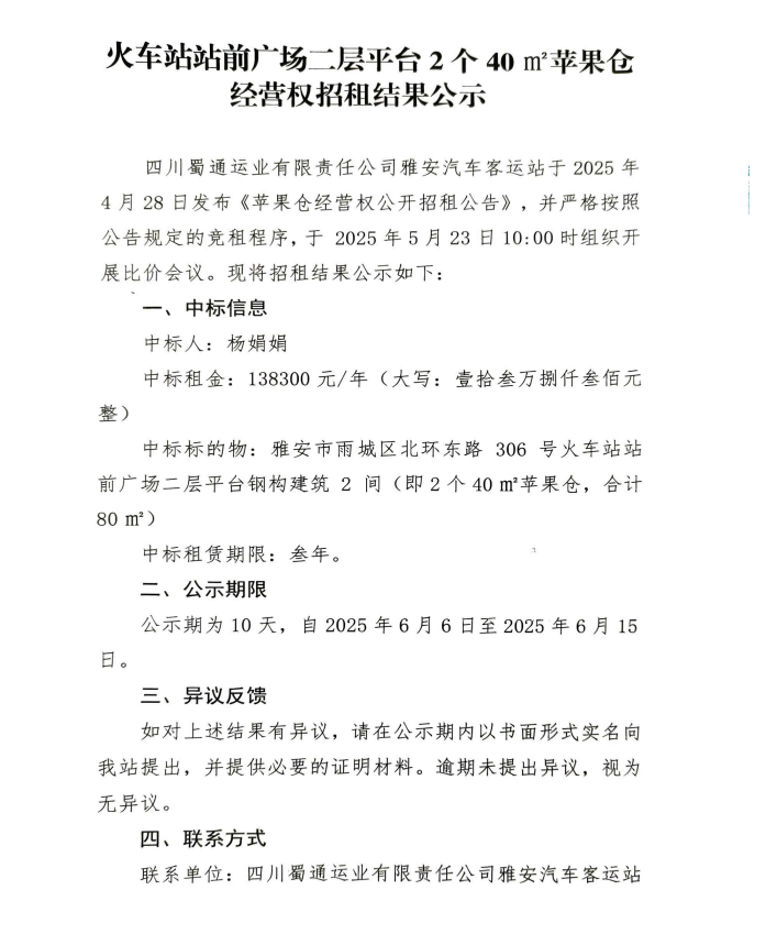火車(chē)站站前廣場(chǎng)二層平臺(tái)2個(gè)40㎡蘋(píng)果倉(cāng)經(jīng)營(yíng)權(quán)招租結(jié)果公示