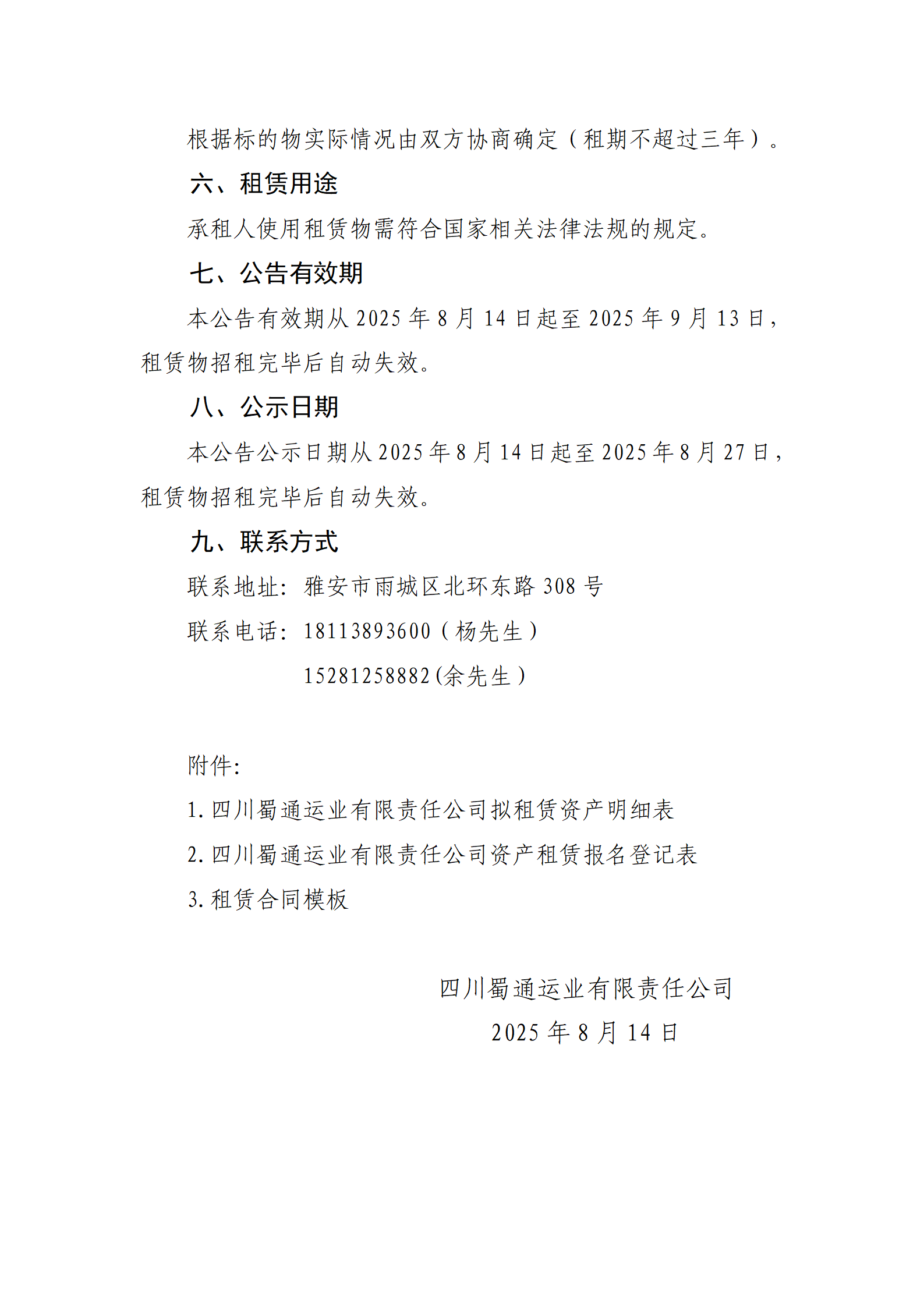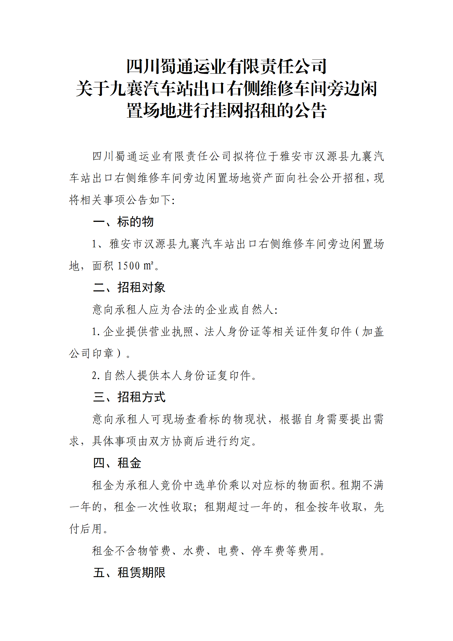 四川蜀通運(yùn)業(yè)有限責(zé)任公司 關(guān)于九襄汽車站出口右側(cè)維修車間旁邊閑置場(chǎng)地進(jìn)行掛網(wǎng)招租的公告