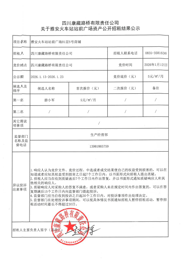 四川康藏路橋有限責任公司關(guān)于雅安火車站站前廣場資產(chǎn)公開招租結(jié)果公示