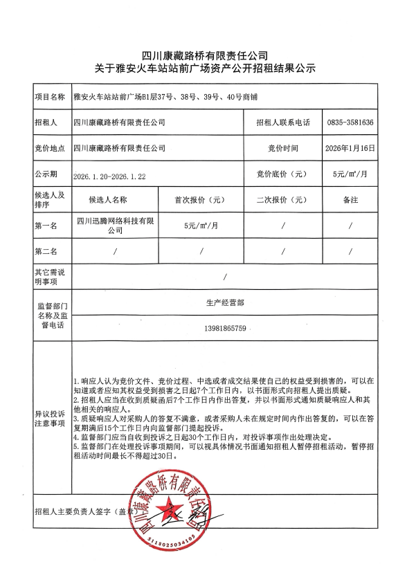 四川康藏路橋有限責任公司關(guān)于雅安火車站站前廣場資產(chǎn)公開招租結(jié)果公示