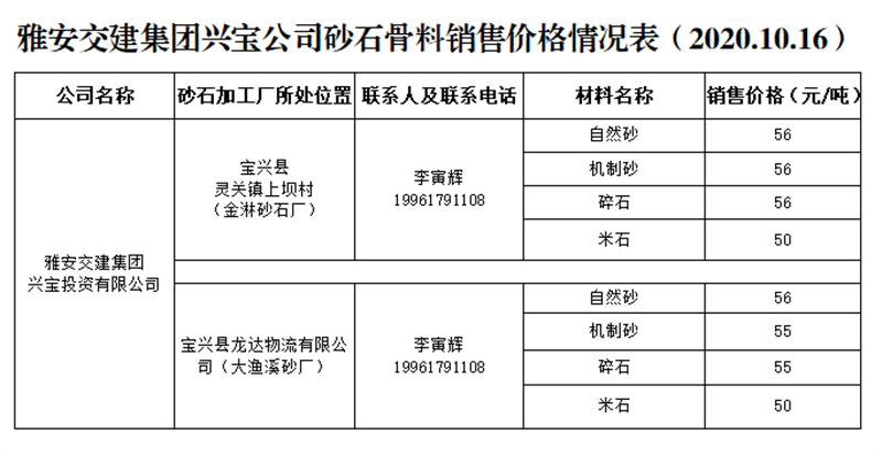 雅安交建集團(tuán)興寶公司砂石骨料銷售價格情況表(2020.10.16)