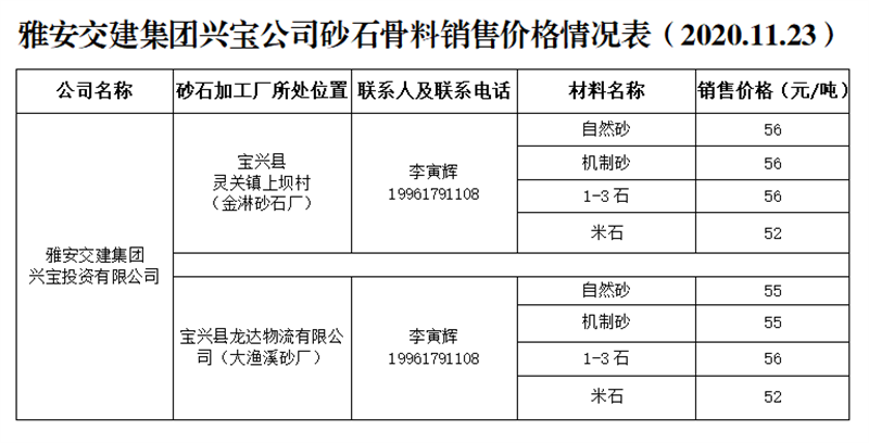 ÑŰ²½»½¨¼¯ˆFÅdŒš¹«Ë¾É°Ê¯¹ÇÁÏäNÊÛƒr¸ñÇé›r±í£¨2020.11.23£©
