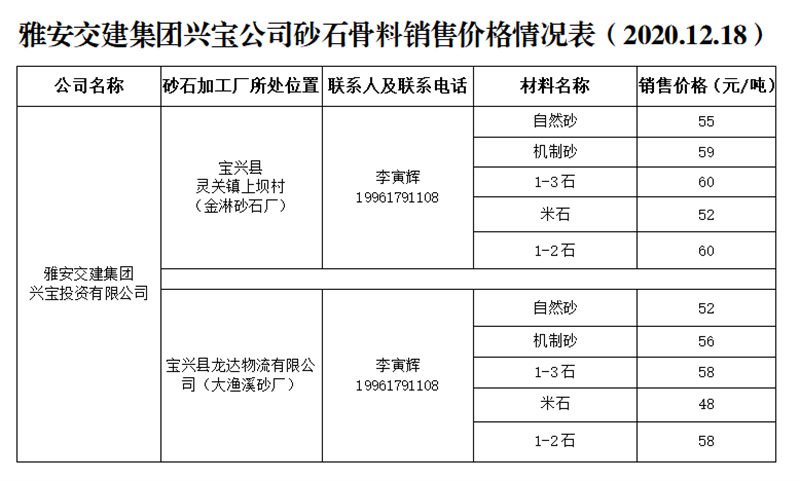 ÑŰ²½»½¨¼¯ˆFÅdŒš¹«Ë¾É°Ê¯¹ÇÁÏäNÊÛƒr¸ñÇé›r±í£¨2020.12.18£©