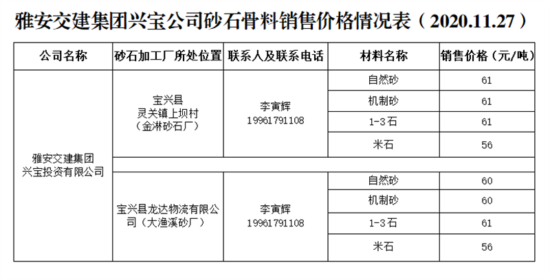 雅安交建集團(tuán)興寶公司砂石骨料銷售價(jià)格情況表(2020.11.27)