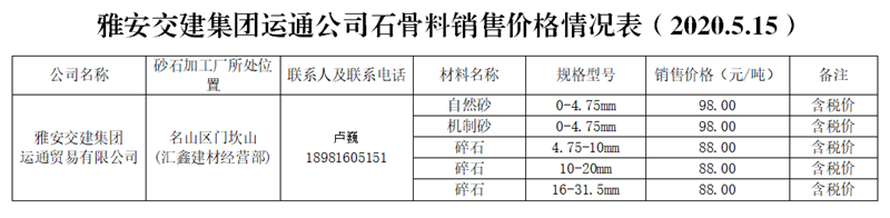 運(yùn)通貿(mào)易有限公司。運(yùn)通公司是雅安市交通建設(shè)(集團(tuán))有限責(zé)任公司獨資子公司,主要負(fù)責(zé)雨城區(qū)中心城區(qū)河道外砂石經(jīng)營管理工作。目前,公司與名山區(qū)匯鑫建材經(jīng)營部確定了代加工合作關(guān)系,已投產(chǎn),預(yù)計年生產(chǎn)能力約30萬噸。