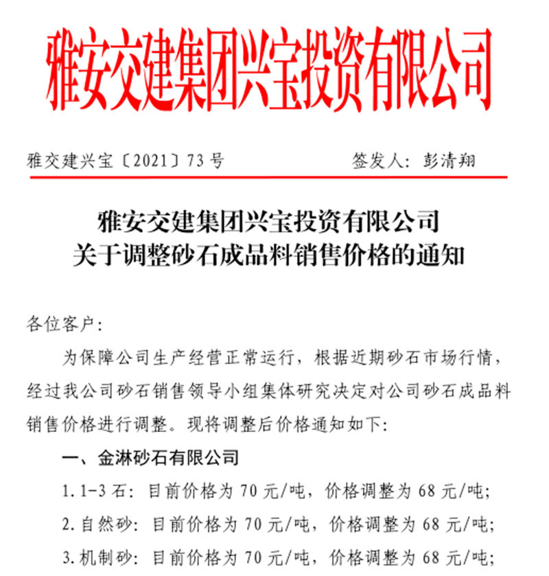 雅安交建集團(tuán)興寶公司關(guān)于調(diào)整成品料銷售價(jià)格的通知(2021.10.15)