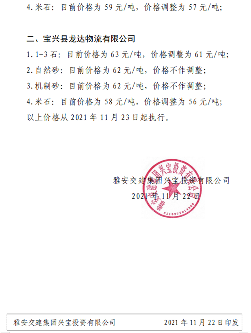 雅安交建集團(tuán)興寶公司關(guān)于調(diào)整成品料銷售價(jià)格的通知(2021.11.23)