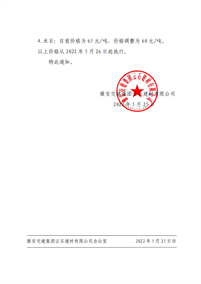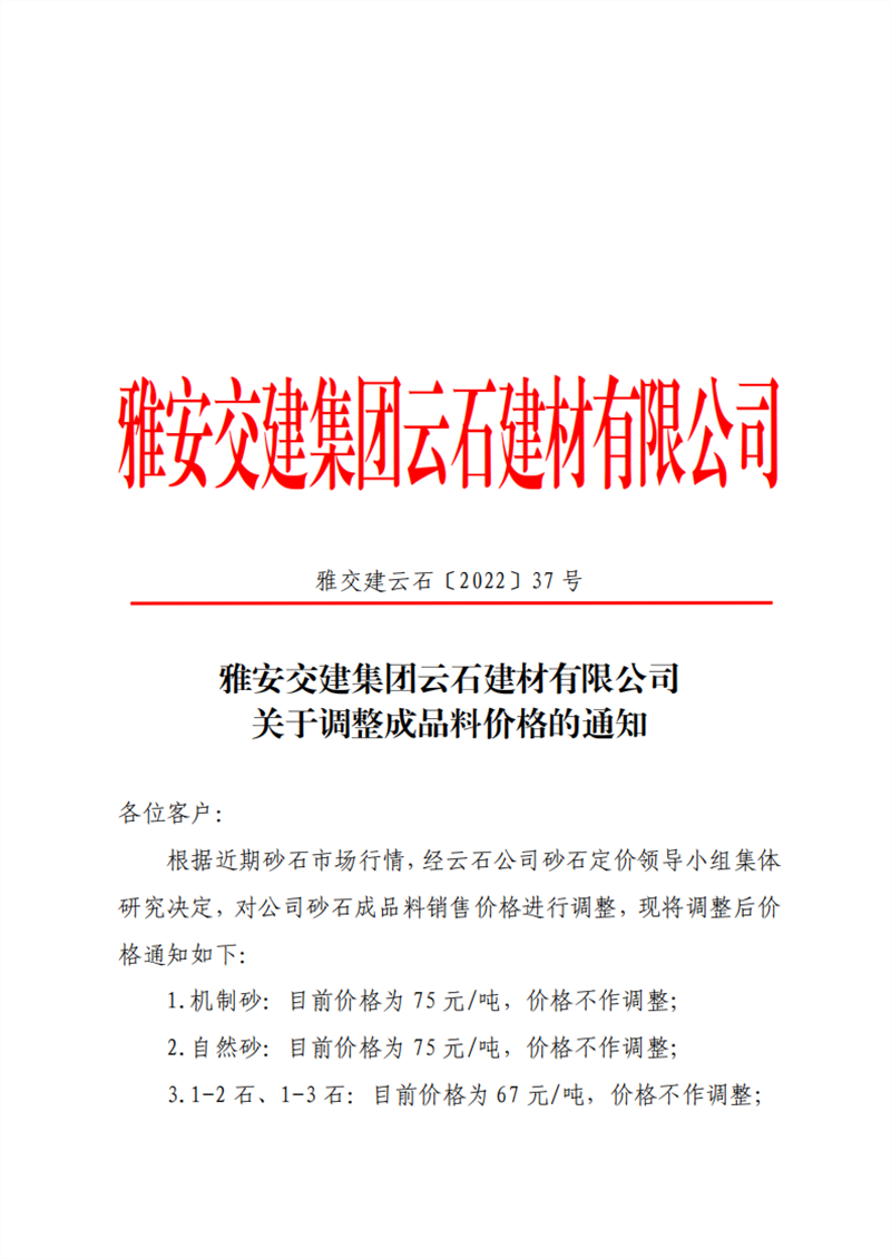 雅安交建集團云石建材有限公司 關(guān)于調(diào)整成品料價格的通知--2022-5-25