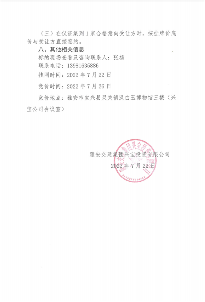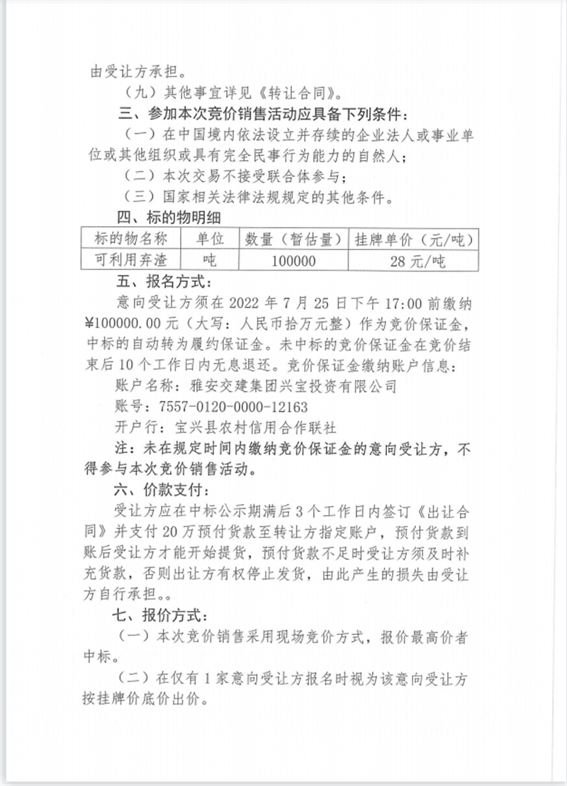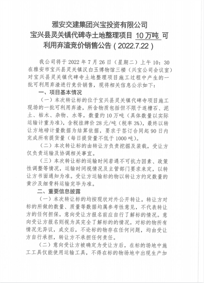 興寶公司寶興縣靈關(guān)鎮(zhèn)代碑寺土地整理項目10萬噸可利用棄渣競價銷售掛網(wǎng)公告掛網(wǎng)公告7.22(5萬噸)