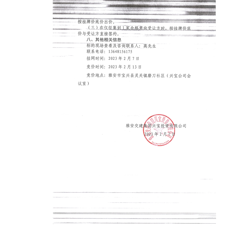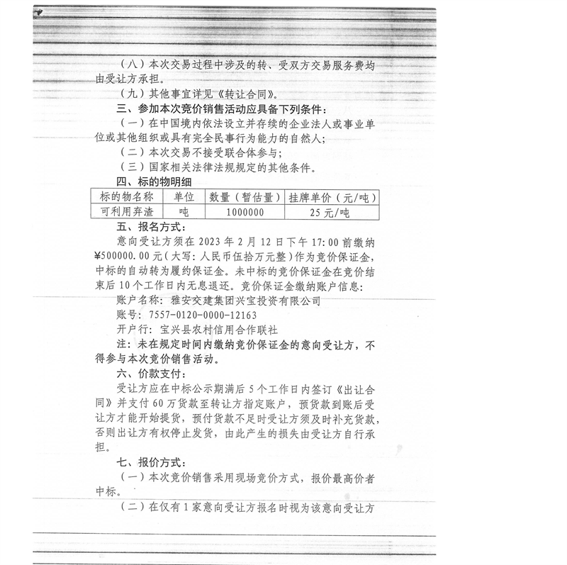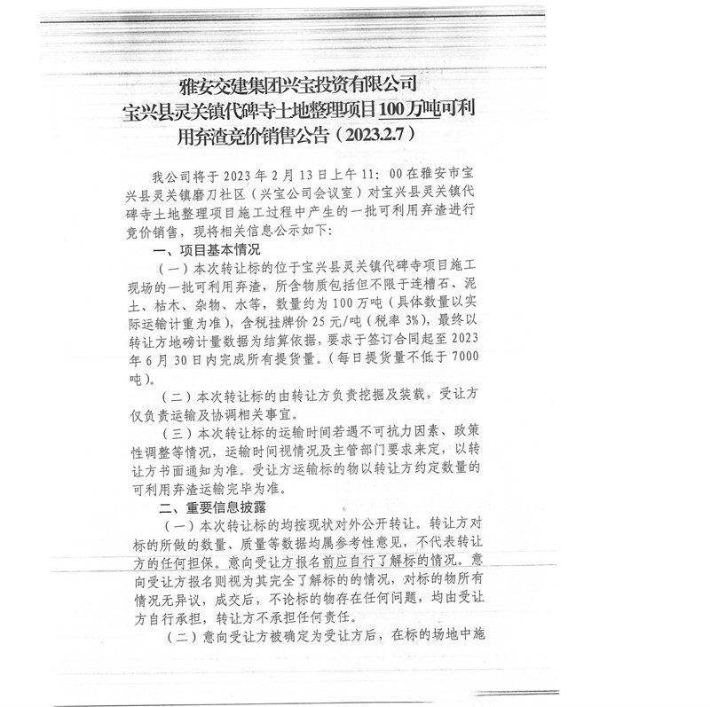 雅安交建集團(tuán)興寶投資有限公司100萬(wàn)噸可利用棄渣競(jìng)價(jià)銷售流標(biāo)公告(2023.2.13)