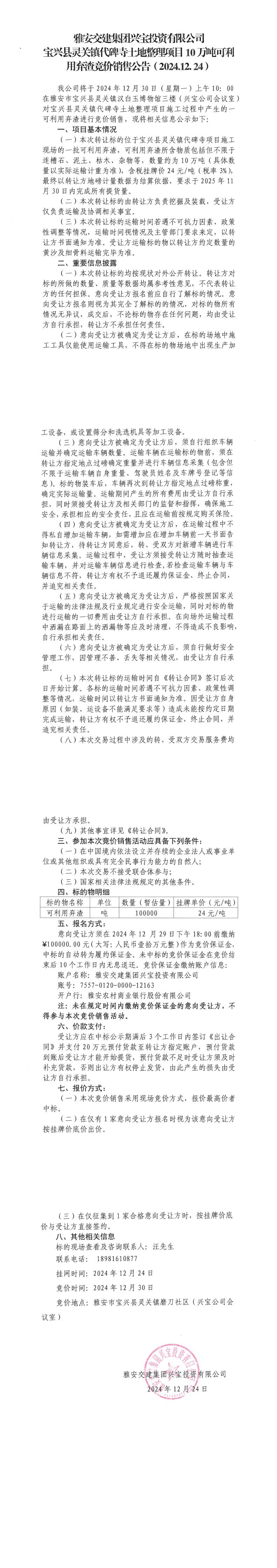 雅安交建集團(tuán)興寶投資有限公司靈關(guān)鎮(zhèn)代碑寺土地整理項(xiàng)目10萬(wàn)噸可利用棄渣競(jìng)價(jià)銷售公告(2024.12.24)