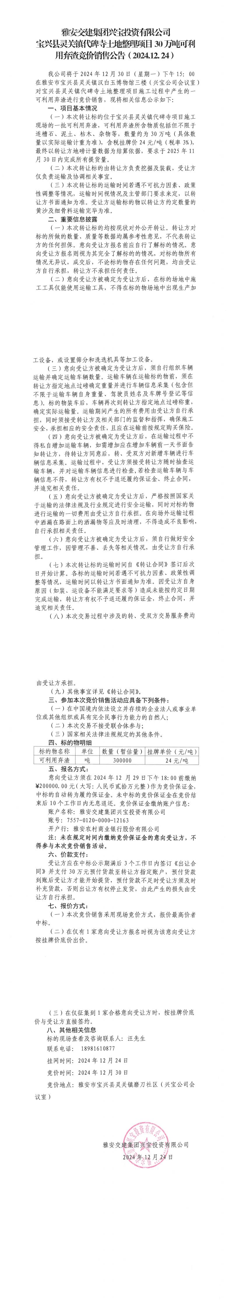 雅安交建集團興寶投資有限公司靈關鎮(zhèn)代碑寺土地整理項目30萬噸可利用棄渣競價銷售公告(2024.12.24)