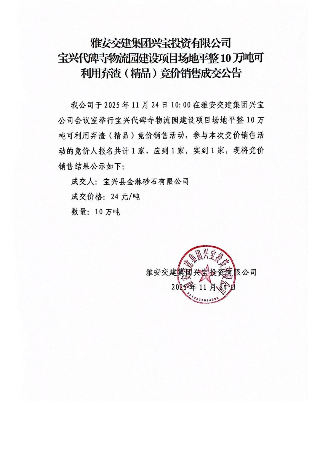 雅安交建集團(tuán)興寶投資有限公司10萬噸可利用棄渣(精品)競(jìng)價(jià)銷售成交公告(2025.11.24)