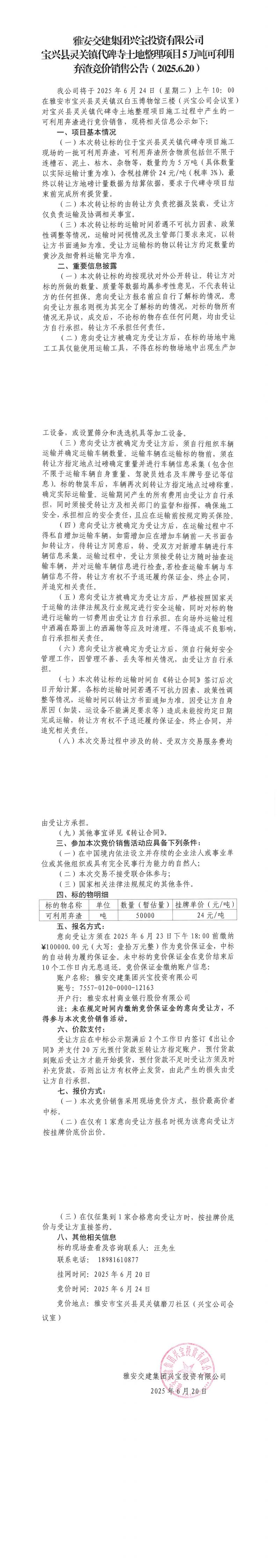 雅安交建集團(tuán)興寶投資有限公司寶興縣靈關(guān)鎮(zhèn)代碑寺土地整理項(xiàng)目5萬噸可利用棄渣競價(jià)銷售公告